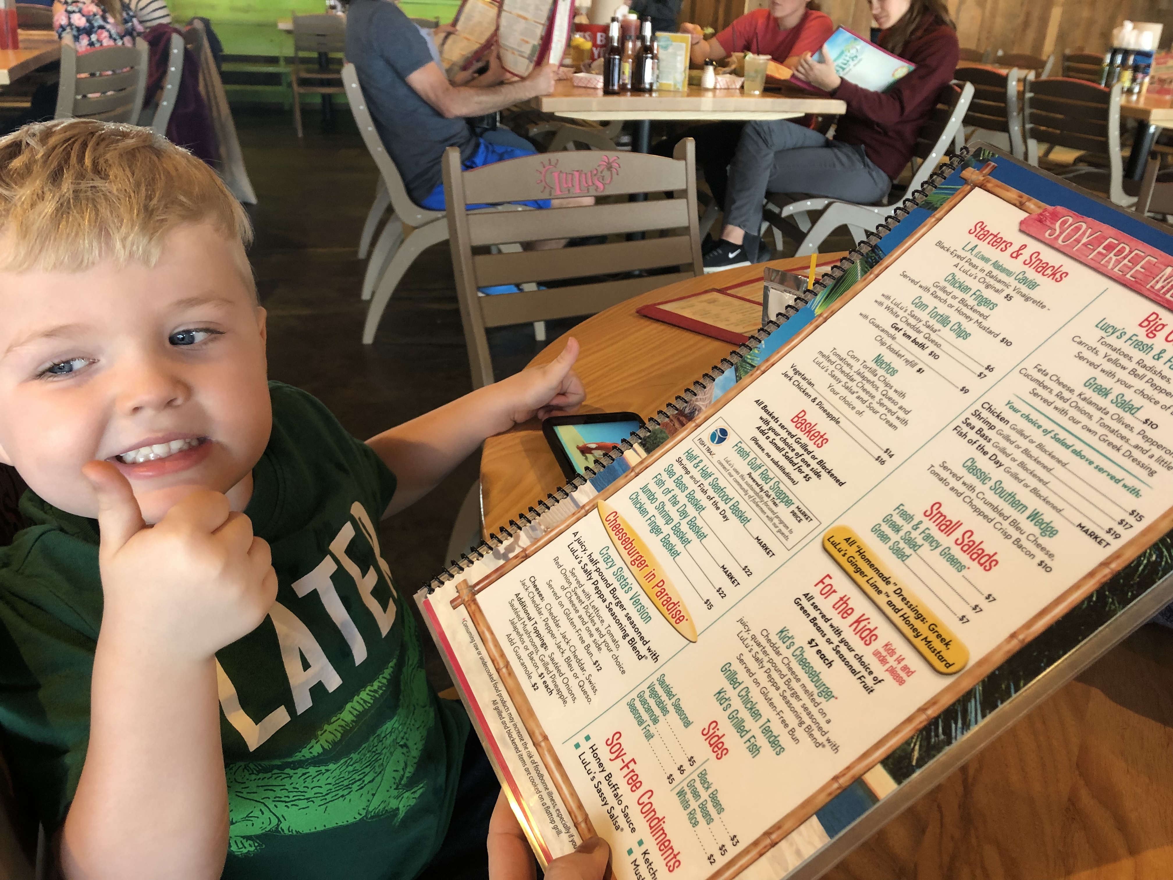 The last three nights we ate at Longhorn Steakhouse, LuLu’s and Hard Rock Cafe, all of which have their allergens posted online. My favorite by far was LuLu’s. They actually had separate menus for each food allergen AND a second waitress came out to take our order; she said the cook would make the boys’ food in a different area of the kitchen, change his gloves and use all new equipment. The service was SPECTACULAR, and it makes my heart so happy to watch my kids pick out food from a menu “just for them”.